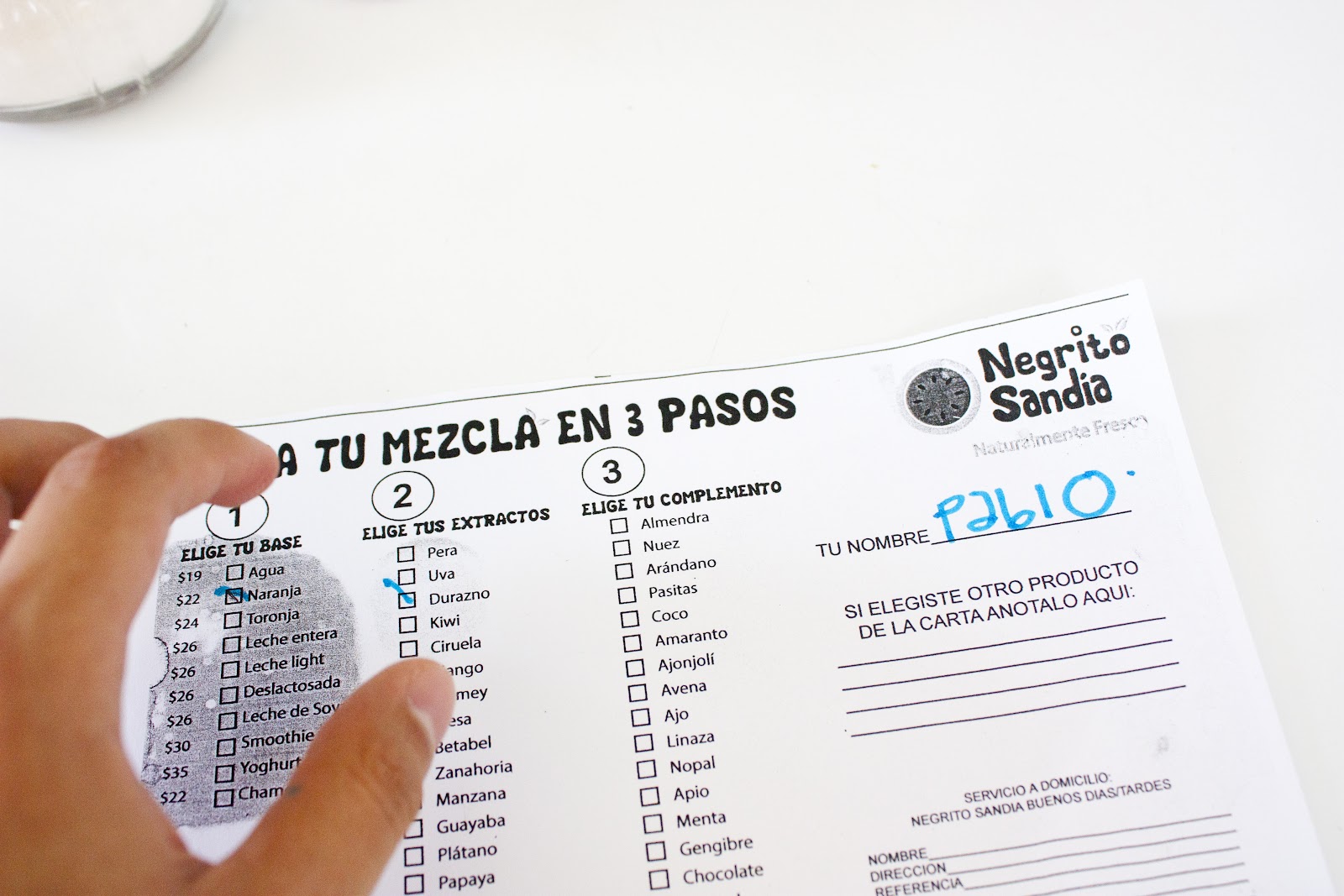 4.- Marca en la comanda tu pedido ( si pediste un juego tienes que escoger tu base, dos frutas y un complemento)